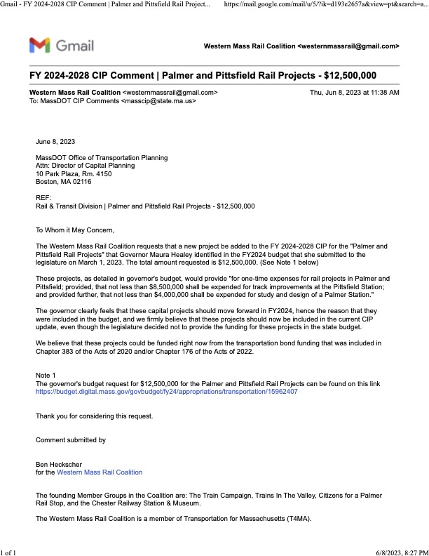 After the Massachusetts legislature cut the Governor’s proposed East-West rail funding from the FY2024 state budget, Ben Hecksher and the Western Mass Rail Coalition lobbied the Governor and MassDOT to restore this important early action funding by including it in the MassDOT CIP.