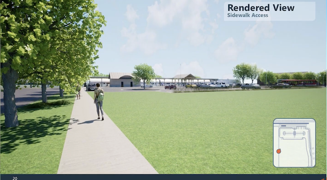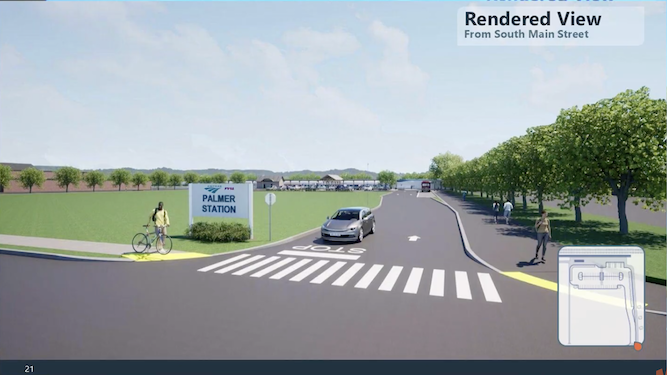 Conceptual design of street entrance to the Palmer Amtrak station, showing shared bicycle/pedestrian way along the right side. MassDOT/VHB slide presented on 10/7/25 at PHS public meeting.
