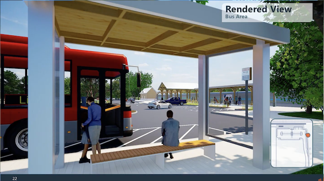 Conceptual design for PVTA bus stop at the Palmer Amtrak station, showing the train boarding platform in the backgound. MassDOT/VHB slide presented on 10/7/25 at PHS public meeting.