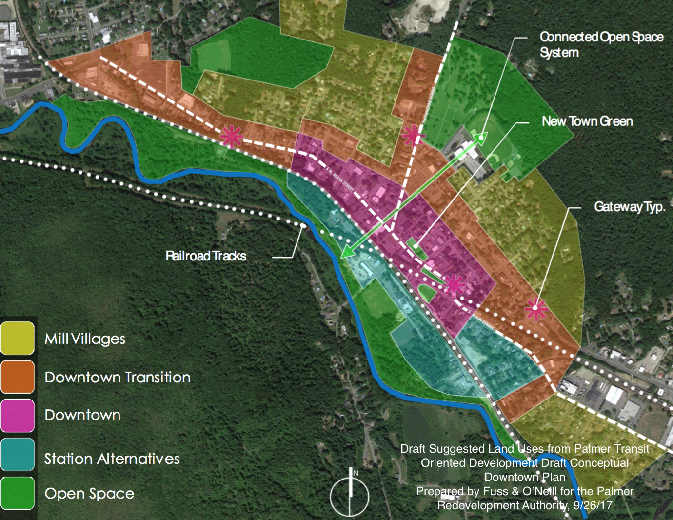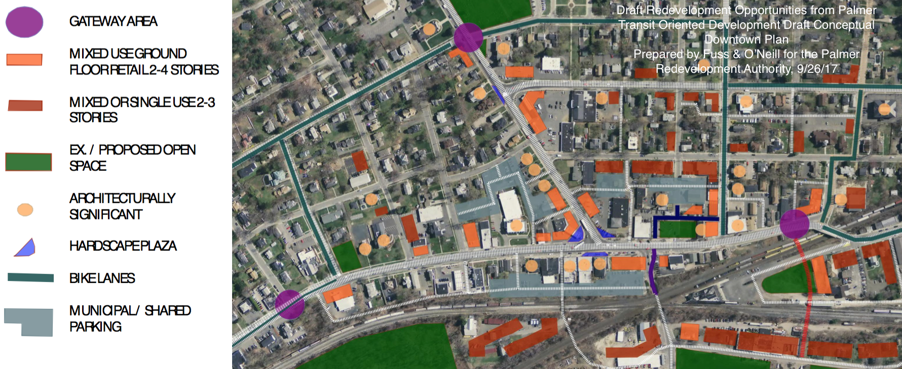 Key slides from Fuss & O’Neill’s Palmer Transit Oriented Development Draft Conceptual Downtown Plan, plus an additional slide, all prepared for the Palmer Redevelopment Authority. Follow link above to the 9/26/17 presentation slideshow for a more complete version of this draft conceptual plan.