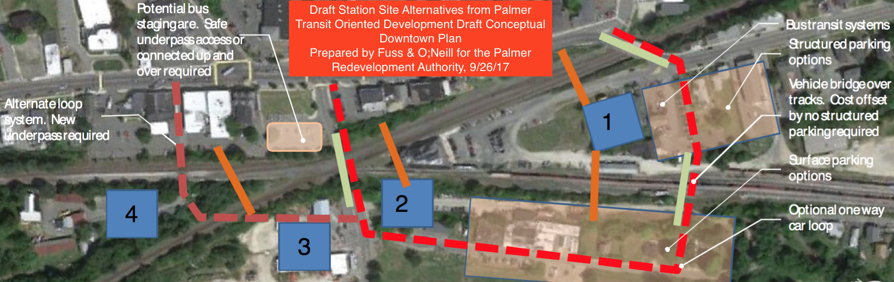 Slide showing draft station site alternatives. From Palmer Transit Oriented Development Draft Conceptual Downtown Plan, prepared by Fuss & O’Neill for the Palmer Redevelopment Authority, 9/26/17.