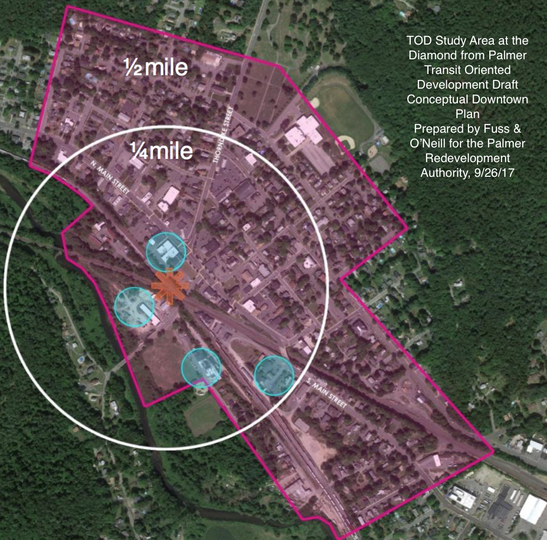 Slide showing transit-oriented development (TOD) study area at the “diamond” (junction of the east-west Inland Route and north-south Central Corridor rail lines). From Palmer Transit Oriented Development Draft Conceptual Downtown Plan, prepared by Fuss & O’Neill for the Palmer Redevelopment Authority, 9/26/17.