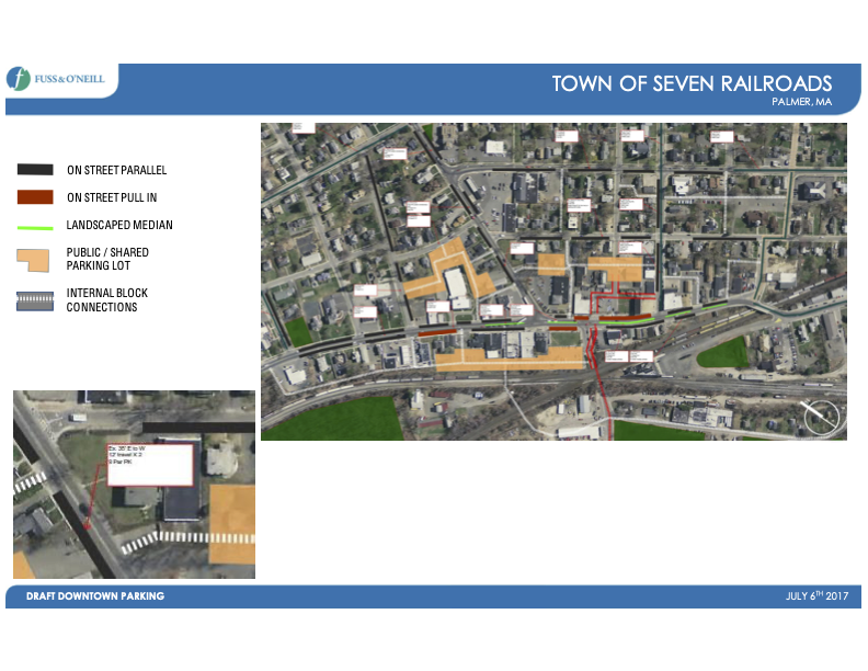 Slide showing draft downtown parking areas. From Palmer Transit Oriented Development Draft Conceptual Downtown Plan Progress Presentation, 9/26/17. Prepared by Fuss & O’Neill for the Palmer Redevelopment Authority.