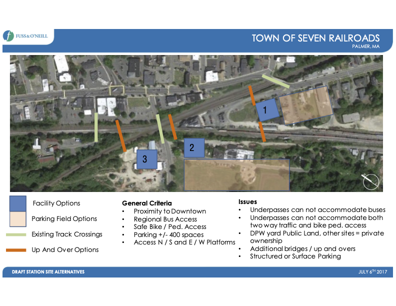 Additional slide showing draft station site alternatives. Prepared by Fuss & O’Neill for the Palmer Redevelopment Authority, 9/26/17.