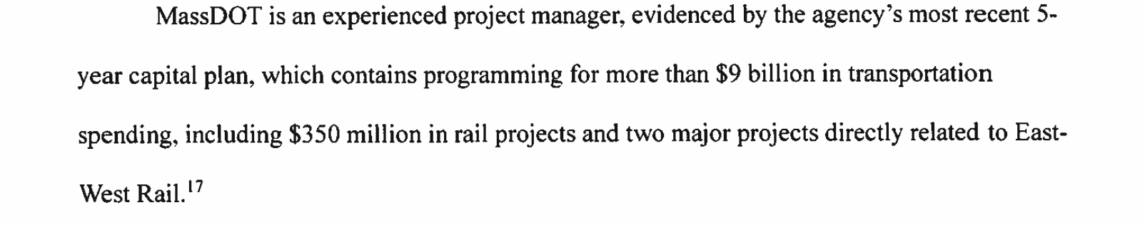 We strongly second the Commission endorsement of MassDOT as an “experienced project manager, evidenced by the agency’s most recent 5-year plan, including $350 million in rail projects and two major projects directly related to East-West Rail.” (p. 19)